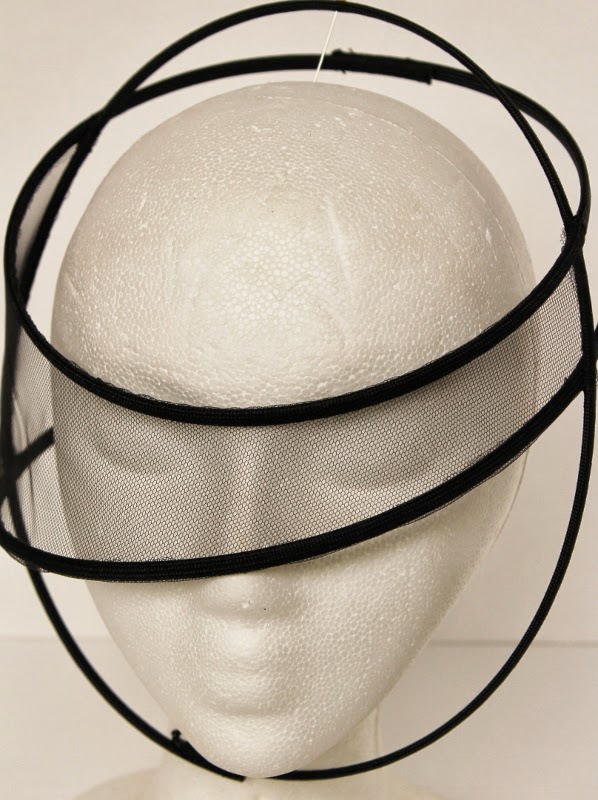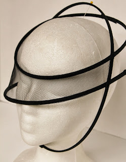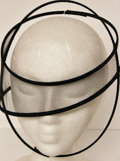 I've been experimenting with some products we have; it's a great escape from paperwork sometimes! We sell "millinery wire" a.k.a. "hat wire" in 3 different gauges but I must admit I've always found it a challenge to work with. I seem to have heavy hands and can never get a nice look as my wire ends up all wobbly. So I decided to try one of our more stable products: German Plastic Boning in the 5mm width (product number 50-8125-05). It's a narrow flat boning that can be sew to it's self or to anything else that can be sewn and it can be shaped a bit with heat from a warm iron. German Plastic boning is white to start and since I wanted black I threaded the 5mm German Plastic boning into a length of our black nylon braided lacing (the white is dyeable so I could to this in any colour) Product # 03-7176N-90. I took 2 meters of the boing and 2.5 meters of the lacing because I wanted to be able to cut lengths and close the lacing over the ends of each bone. The lacing melts with the heat of a "lighter" so I was able to seal each section of lacing over the bone which meant that the bone could not slide out and melting the ends was a lot faster than sewing would have been.