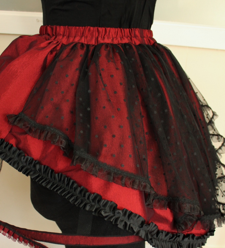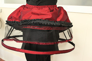 For the skirt I opted to use a layer of tutu net from Farthingales for the longer layer and the red/black light weight shot taffeta (from www.voguefabricsstore.com) for the shorter top layer. They get sewn together and gathered into the same waistband, which I made in the same red/black shot taffeta - the lower binding of the corset was done in the same fabric so they blended well. I added a third layer of dotted net (which also came from Vogue Fabrics) and modified the long back skirt pattern piece to get the shape you see here. I included it with the other layers when I attached them to the waistband. Why did I add this third layer? Because I could :-)
