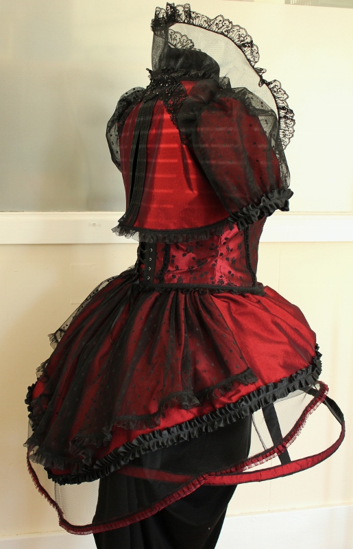 The fabric that I used for the bolero was red/black shot light weight taffeta for the body and spotted black net for the outer sleeve (both from www.VogueFabricsStore.com mail order) and black "corset fabric" (not coutil) for the lining, along with tutu net to support the outer sleeve and to create the stand up collar and a small piece of woven boning sometimes called "Rigelene" to support the center back of the collar. You can see it in the image above and it will keep the collar up despite hair or head movement. (all these items are from www.farthingalescorsetmakingsupplies.com). The ruffled trim is all from my stash and some of that is from my local Fabricland here in Canada.