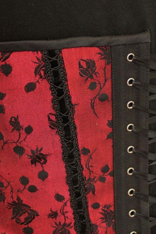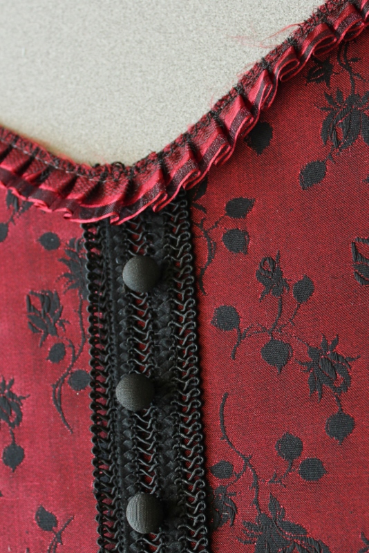 I bound the top edge with black silk shantung because I actually had several bias strips in my stash, I bound the bottom with bias strips of the skirt fabric so that the bottom edge of the corset would blend seamlessly with the skirt. Ultimately I decided to add some black organza ruffle to the bottom edge, simply because I had some left after using it on the bolero and the skirt. Why not use it all up, besides it ties them all together.